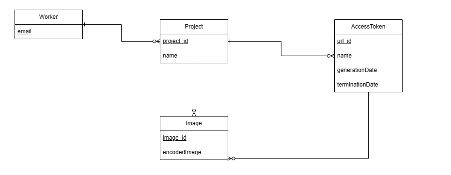 The data structure is based on projects that can be created and owned by workers. For each project, temporary access tokens can be generated and shared with customers or other stakeholders. Images captured through these tokens are automatically associated with the corresponding project, enabling photo collection without requiring users to manually specify which project they belong to.