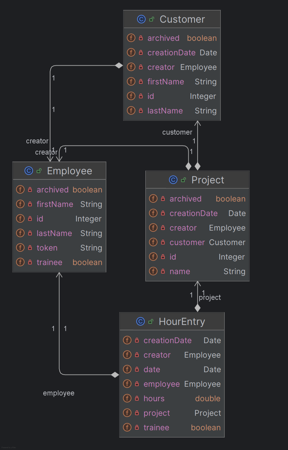 As can be seen in the architecture diagramm, workers have access to a mobile app, where they can track their working hours. The app communicates with a backend service, that stores the tracked data. With the SP-Client, all the Data of the workers can be accessed to check the hours invested into the projects. The database scheme itself looks like the following: